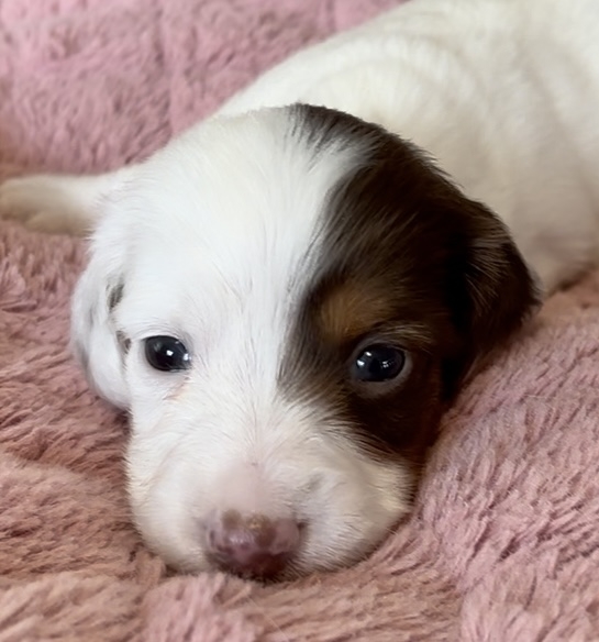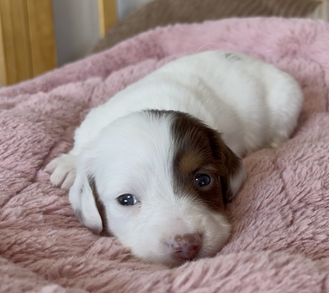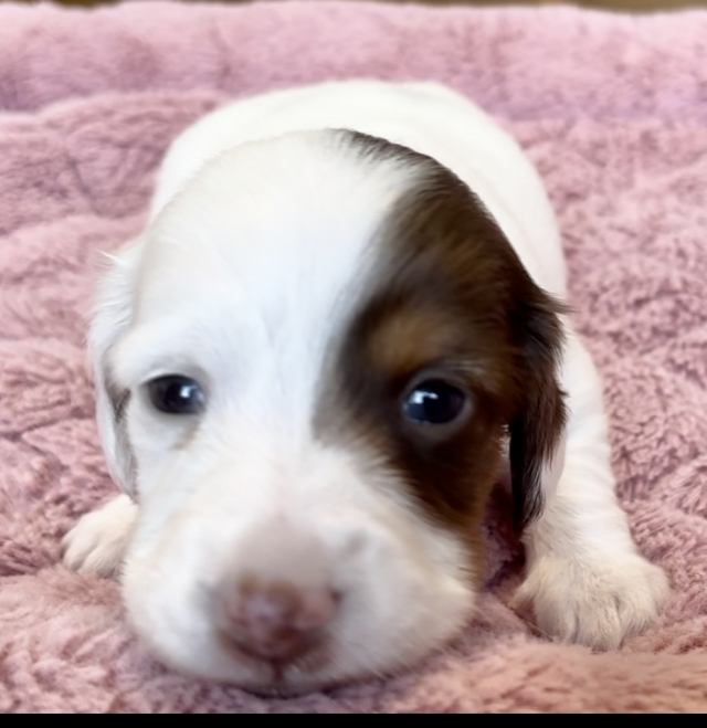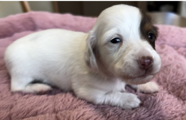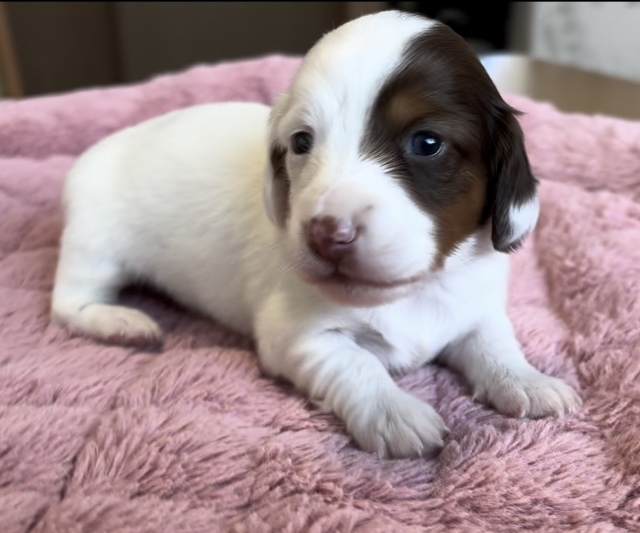 コメント | 9/29 健康診断実施 異常無し 当犬舎子犬は、 人間、成犬(当犬舎の)と 沢山触れ合いながら、して良いこと、悪いことなど 犬社会勉強しながら成長していきます。 社会化期どのような環境で過ごすかが 非常に大事です。 パイボールドは成長過程で柄変化する個体も有ります 当犬舎子犬はどの子も、 ご見学頂きましたお客様から感想ですが、 「実物の方が可愛い!写真写り悪い」など褒めて頂きます 血統書はコピーのみをお渡しになります!! 理由 託しました子犬が繁殖に使用されるのを避ける為 転売防止の為。 ️ MIXではございませんので、 血統書は発行致します。 血統書の子犬マイクロチップ番号と子犬に挿入済マイクロチップ番号は同じです。 【マイクロチップリーダーで番号読み取れます】 お渡し致しましたコピーの血統書が、 ご購入された子犬の血統書で間違い無い事が、どなたでも、確認とれます。 一般のご家庭で過ごす分にはコピーで支障はございません。【繁殖の際に原本が必要】 当犬舎は子犬の生まれた日からお引き渡し日までの成長の写真動画をお渡ししております。 当犬舎出身の子達の親族会等あり、我が子の親戚犬とも繋がることが可能です。【希望者のみ】 健康な子犬をご紹介出来ます様に、両親犬にPRA、CL、骨異形成症の遺伝病検査済です。 PRA【進行性網膜症】 CL、【神経セロイドリポフスチン】 骨異形成症 等の遺伝病を発症する事はありませんので、 ご安心下さい 詳しくは、ブリーダープロフィール欄に記載しておりますのでご覧に頂けましたら、幸いです。 胴長短足のダックスは腰膝に負担がかかりやすい体型です。ヘルニア、パテラのリスク軽減する為、骨格、筋肉がしっかりした個体になるように心掛けてブリーディングしております。 お顔や身体の柄は、このまま変わらない子や、変わる子も居ます。 サイズもあくまで予想となります。 【その子の生まれ持った体格や、 成長する段階の食べ物、運動量など、生活環境により変わってきます】 ミニチュアサイズの子、カニンヘンサイズに近いの子、ミニチュアサイズオーバーに成長した子と旅立ちました先でそれぞれです。 柄を重視なさる方は、ある程度、柄の予想がつくまで、 サイズを非常に気になさる方も成長の様子を見られる事をお勧め致します。 お引き渡し前に、初回ワクチン、検便、簡易健康診断をしてお渡しとなります。 【獣医師の健康診断表をお渡し】 初回ワクチン代は別途、回数分必要です。 パパ犬、ママ犬、兄弟犬達、人間と沢山触れ合い、一番大切な社会化期を過ごして成長します。 子犬、親犬共に、管理が行き届く環境(一般家庭に近い)で生活しております。 写真は随時更新致します ママは5キロ ブラックタンパイボールド ビビリな面もありますが、甘えん坊。 パパは、6キロ ブラックタン 初めましての方に人見知りしますが、 慣れたらグイグイ甘えてきます。 もっと沢山の写真や動画などご覧になりたい方はお気軽にお問い合わせください。 犬舎にご来舎にての見学の ご希望のお客様は、予めご見学希望日を複数日、お知らせ下さい。調整させて頂きます。 その際ご来舎される人数、交通手段を添えてお問い合わせ頂きますと助かります。 WEB見学【LINEビデオ通話使用】も、お申し付けください。 実際にご来舎を迷われる場合は、先にWEB見学され、気に入って頂けましたら、実際にご来舎頂くと言う事も可能です。 勿論WEB見学は無し最初から直接ご来舎見学でも大丈夫です。 子犬の予約【子犬の確保】権利は、お問い合わせ、ご見学の順番では無く、ご予約金をお支払い頂きました方が、優先となります為、メール、掲示板等、やり取りの最中、ご見学日を具体的に取り決め後でも、売約済みになる可能性もございます。 ご見学日の前日までは、売約済みになってしまう可能性もある事をご了承ください。【ご見学日前日に当犬舎から明日ご見学よろしくお願い申し上げます。との連絡致します。それ以降ご見学までは、優先的にご案内になります】 ご見学に際してお願い事です 同じ子犬に、ご見学がとても集中してしまう事がございます。 同日の同一子犬のご見学は、子犬のストレス、疲労を考慮しまして受付しておりません。 同日の見学希望が重なる場合は、後のお客様にはご見学日変更をお願いする流れになります。 実際触れ合い、父母犬をご覧になりご決断は重要ですので、ご見学は大歓迎です。 殆どのお客様が真剣にご検討でご来舎して頂いてますが、ご見学意図が、異なるお客様もいらっしゃいます。 当犬舎の子犬でなくても別に良い方。 横須賀に用事があったついで 動物触れ合いコーナー感覚。 希望犬種が定まってなく ダックス以外もご検討中の方。 子犬を迎える事をご家族全員が 希望されてない方。 今は子犬お迎えできる時期、環境でない方。 上記の様に、ご見学の意図から外れてます方を優先してしまいますと、真剣にご検討中のお客様のご案内が出来ません。