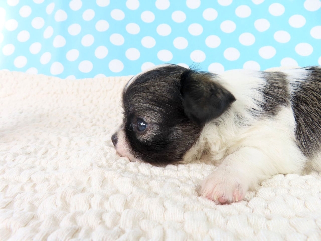 コメント | ※体重などの情報は後日掲載いたします。 モレラがありますが成長ともに塞がることがあるため特に欠点とは考えておりません。 子犬と親犬はブリーダー歴30数年、40数年の経験者と動物看護士などが中心に365日、注意深く、丁寧に観察してお世話をしております。 子犬ちゃんは人間同様、個人差がありますので、子犬ちゃんのお世話の仕方、お食事あげ方はご見学時、お迎え時などに担当のスタッフより詳しくお伝えいたしますのでなんでもご遠慮なくご相談ください。 JKCの全犬種審査員資格者と単犬種パピヨン審査員資格者が在舎しておりますので、パピヨンのスタンダードを熟知しております。 当犬舎はパピヨン一筋50年を超える日本で一番歴史のあるパピヨン専門犬舎です。 犬舎号と登録は1970.10/19です。 日本中の国産のパピヨンで当犬舎の血統が入っていない犬は存在しません。 血統書発行団体JKCより下記表彰を受けております。 JKC特別繁殖奨励賞第1位受賞 犬舎 JKCパピヨン犬種表彰受賞 犬舎 ご見学は大歓迎ですのでどうぞご連絡の上、おいでください。365日年中無休です。 2013年9月1日より「動物の愛護と管理に関する法律」の改正によって、「生体販売時の現物確認・対面販売」が義務規定となりましたので、最低一度は直接犬舎までご来舎いただかなくてはなりません。従いまして今までのようにネットで写真、動画をご覧になっただけではご購入ができなくなりました。これはすべてのブリーダー・ペットショップも例外がありませんので、ご理解、ご協力のほど御願い申し上げます。 手続きに時間がかるため海外への輸出はいたしません。 スタッフの取得資格 (社)JKC 全犬種審査員2名(社)JKC 単犬種パピヨン審査員1名 (国) 動物看護師統一認定機構 愛玩動物看護師国家資格取得(社)JKC スチュアート1名(社)JKC A級ハンドラー1名 (社)JKC C級ハンドラー1名(社)日本愛玩動物協会 愛玩動物飼養管理士2級3名 動物の愛護及び管理に関する法律による動物取扱責任者2名 |