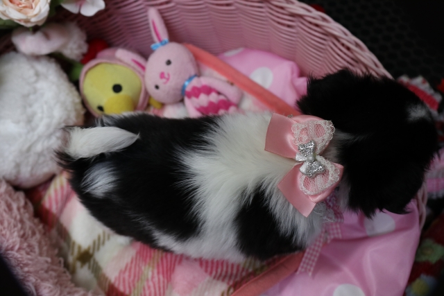 この度は可愛いカニンヘンダックスの女の子を譲っていただきありがとうございます。濱田さんのところからのお迎えは2頭目で、可愛さは初めの子でわかりすぎるほどわかっていたので絶対可愛くなること間違いなしで決めさせていただきました。 どんなことでも相談してくださいねと言う心強い言葉や、可愛い動画を送っていただいたりと本当によくしていただけました。 ワンちゃんは初日からアイコンタクトばっちり、よく食べ、よく寝て、元気いっぱいです。 家にきて1週間、先住犬と遊びながら元気に成長中です。 またよろしくお願いします。(大阪府 女性)
