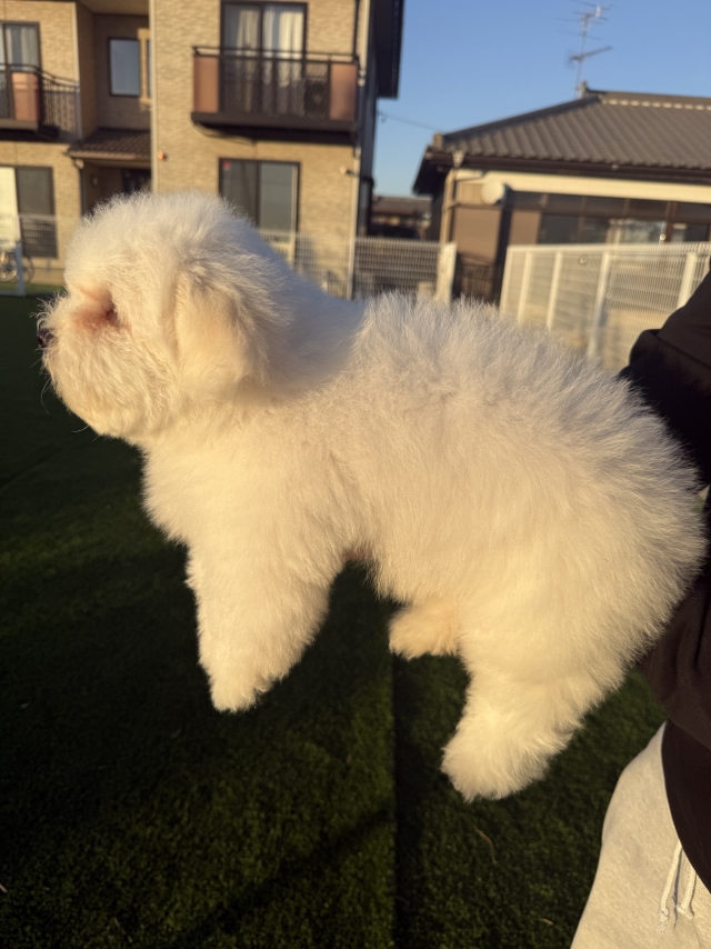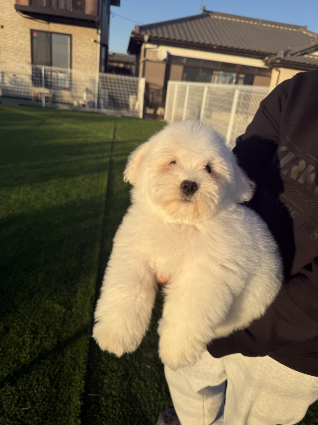 | コメント | 写真だけじゃ伝わらない、実物を見ないと後悔するレベルの可愛さ!!! 毛量が非常に豊かで、ふわふわでもこもこ、まるで綿(コットン)のように柔らかい被毛が自慢の子です パパは韓国KKFチャンピオンのコットン・ド・テュレアールママはminiタイプのビション・フリーゼです 。 コットン・ド・テュレアールは、綿のようにふわふわとした白い被毛が特徴の小型犬です。原産国はマダガスカルで、世界的にも希少な犬種とされています。 日本国内では登録頭数がまだ非常に少なく、入手が難しい“希少犬種”として知られています。柔らかいコットンのような被毛は抜け毛が少なく、匂いもほとんどないため、室内飼育にも適しています。 温厚で人懐っこい性格を持ち、家族に寄り添うコンパニオンとして理想的な犬種です。日本ではまだ出会う機会が限られる貴重な存在として、近年注目されています。 もしご縁がございましたら、ぜひ当犬舎で実際に触れ合い、希少な血統を体感してください。 チャンピオン犬であるパパ譲りの豊かな毛量とショークオリティの美しさに、ママから受け継いだコンパクトな体型が魅力の子です。 体は小さめながら骨量がしっかりしており、抜け毛が少なく体臭もほとんどありません。運動量も多くは必要とせず、マンションやアパートなどの室内飼いにも適したタイプです。 白い毛色ですが汚れにくく、毛が絡まりにくいのでお手入れもらくらく! 元気いっぱいで遊ぶのが大好き、 人が大好きな明るく愛らしい性格です。 初めて犬を迎えるご家庭にも安心しておすすめできます~~ |