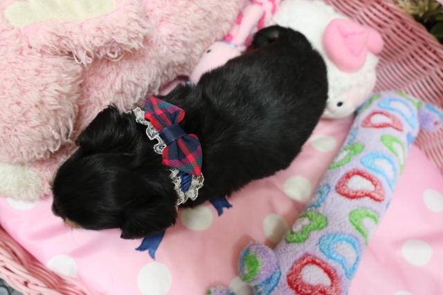 この度は可愛いカニンヘンダックスの女の子を譲っていただきありがとうございます。濱田さんのところからのお迎えは2頭目で、可愛さは初めの子でわかりすぎるほどわかっていたので絶対可愛くなること間違いなしで決めさせていただきました。 どんなことでも相談してくださいねと言う心強い言葉や、可愛い動画を送っていただいたりと本当によくしていただけました。 ワンちゃんは初日からアイコンタクトばっちり、よく食べ、よく寝て、元気いっぱいです。 家にきて1週間、先住犬と遊びながら元気に成長中です。 またよろしくお願いします。(大阪府 女性)